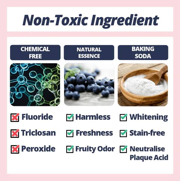 Unlike ordinary whitening toothpaste with harmful abrasives and chemicals, with the chemical reaction of dissolved baking soda, this fluoride-free toothpaste can penetrate the enamel crevices and remove food particles, bacterial plaque, and deep stains embedded there.