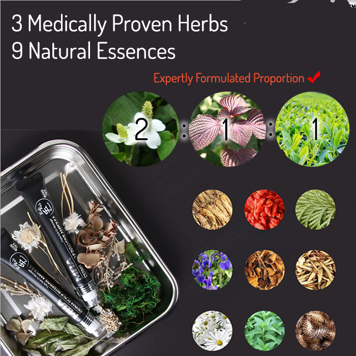 - Houttuynia Cordata Extract 7%, Perilla Leaf Extract 3.5%, Green Tea Extract 3.5%, 9 Herbal Plants Combination 15%