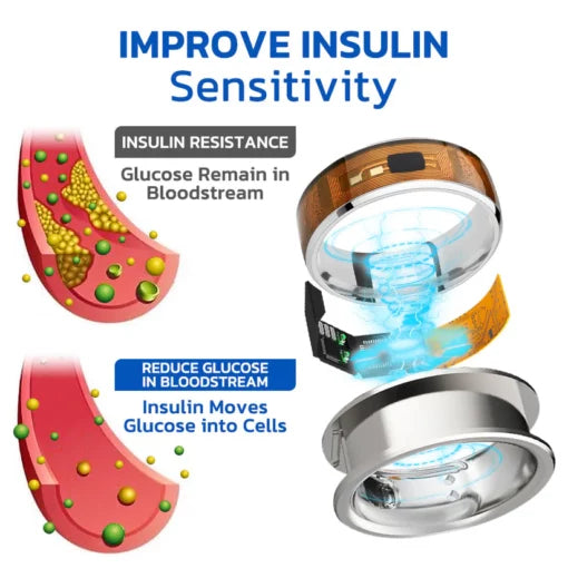 The Remifa™ SugarRing electroacupuncture health control ring to increase insulin sensitivity. This method delivers controlled electrical impulses to stimulate muscle tissue, increasing glucose uptake into muscle cells. Muscle contractions facilitate the efficient conversion of glucose into energy, reducing blood glucose levels.